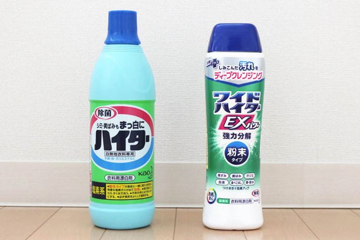 塩素系漂白剤(左)と酸素系漂白剤(右)。衣類用の漂白剤は専用の洗濯槽クリーナーより安価なうえ、残りを洗濯に使用できて一石二鳥