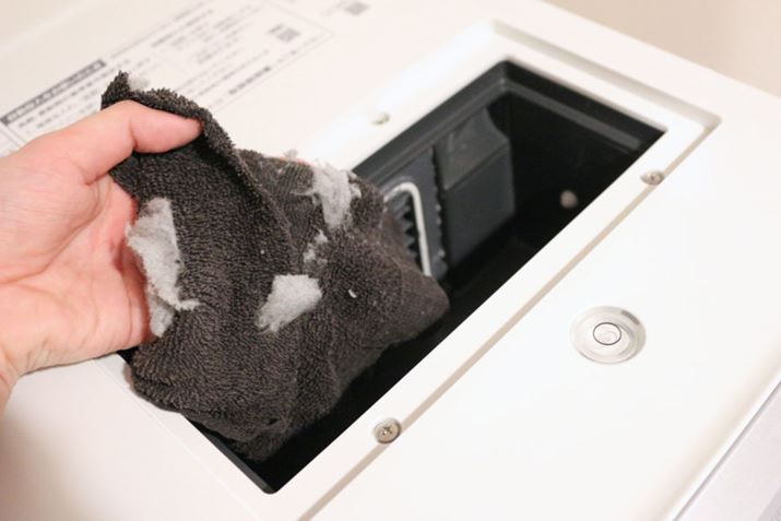 ティッシュや固く絞ったタオルなどでぬぐうと、ほこりがするりと取れます。気持ちいい! 汚れが溜まってフィルターの目が詰まっている場合は、フィルターを傷めないようにぬるま湯でやさしく洗い、しっかり乾かします