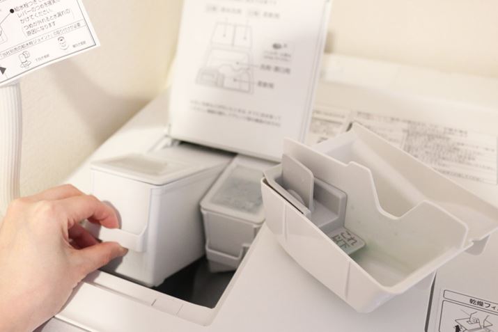外れないパーツに洗剤や柔軟剤がこびりついてしまっている場合は、60℃くらいのお湯をかけて溶かしてからこするという手もありです(濡れてもよい場所限定。お湯の温度が高すぎると故障の原因になるので注意)