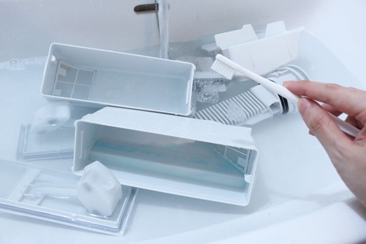 外したパーツはさっとゆすいだ後ぬるま湯につけ、歯ブラシでやさしくこすります。洗剤などは特に使用しなくても、十分きれいになります