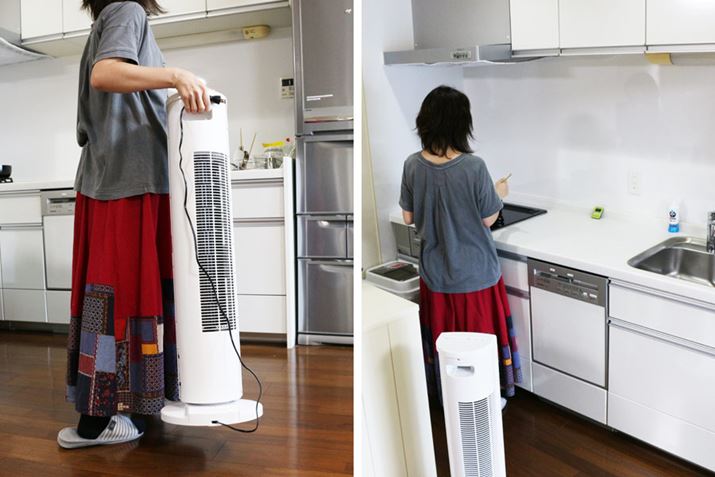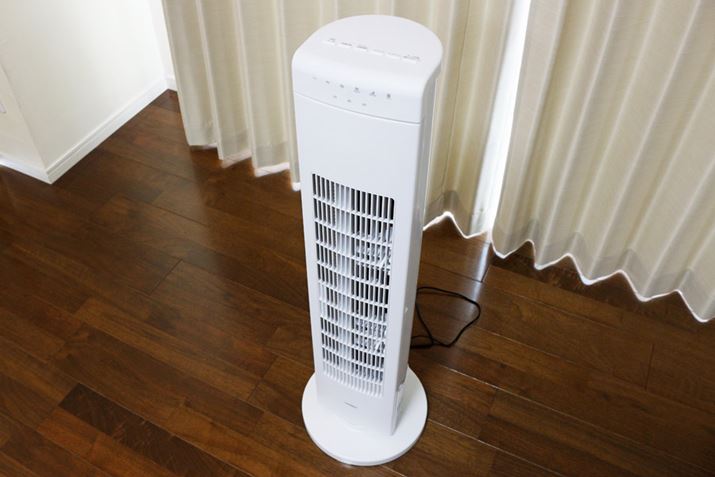 また、全体的に円柱形状なので、横を通った時に本体にぶつかりにくいのはありがたい。一般的な扇風機を使っている筆者の場合、送風口に体が触れ、向きが変わってしまったことが何度もあります……