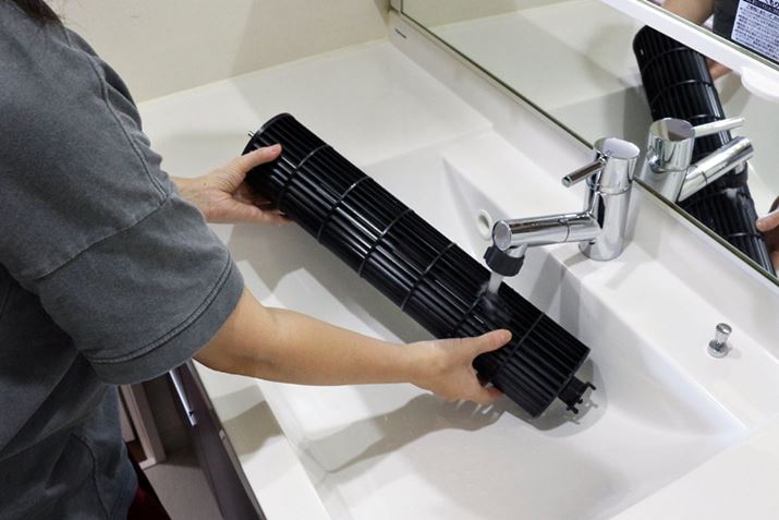 外したファンは水洗いできるだけでなく、薄めた中性洗剤で洗浄可能。ブラシなどを使うとよりキレイになります。流水ですすいだのち、陰干ししてしっかり乾かしてから本体に戻すようにしましょう