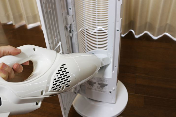 さらに、ファンを取り外したところに溜まったホコリも掃除機で吸い取ったり、布で拭くこともできます。タワーファンの内部がここまで掃除できるのは、気持ちいい!