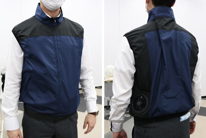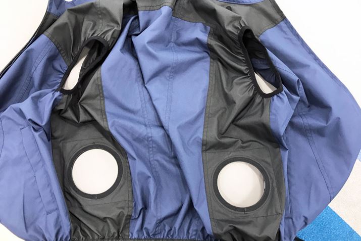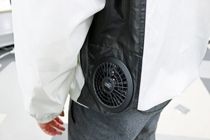 クールウェアには、両サイドにファンが装備されています。サーキュレーターの設計技術を活用し、大風量を放出できるようにしているのだそう。着心地を配慮し、ウェア内側のファンの厚みは34mmに抑えています。「クールウェアPRO」を選択した場合、ファンは別売(参考価格2,780円/税別)