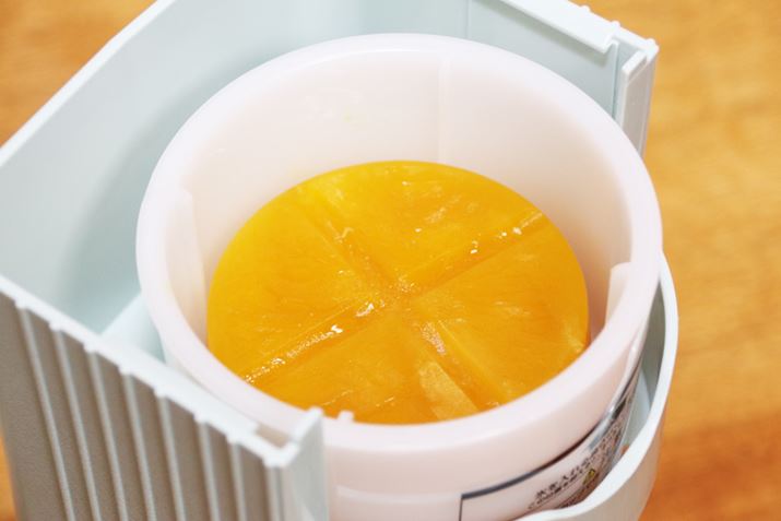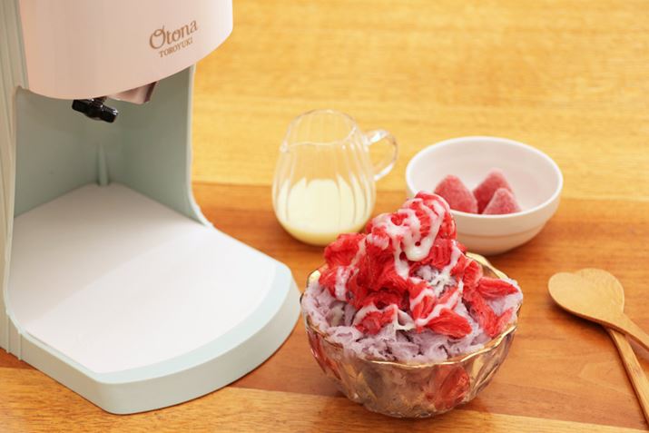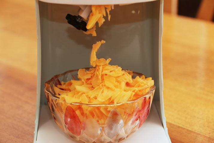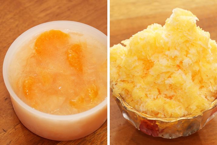 基本的な使い方を理解したところで、次は、味付きの氷でかき氷を作ってみます。味付きのかき氷といえば、氷にミルクやシロップ、ジュースなどのフレーバーを加えて作る台湾式かき氷「雪花氷」が有名。ジュースを凍らせた氷を準備すれば、雪花氷のようなトロリとした食感のかき氷が作れるというので試してみました。