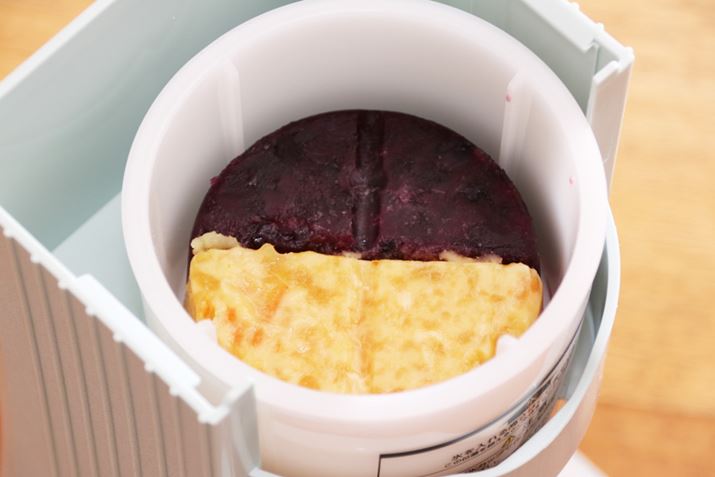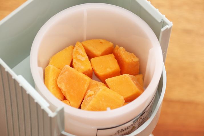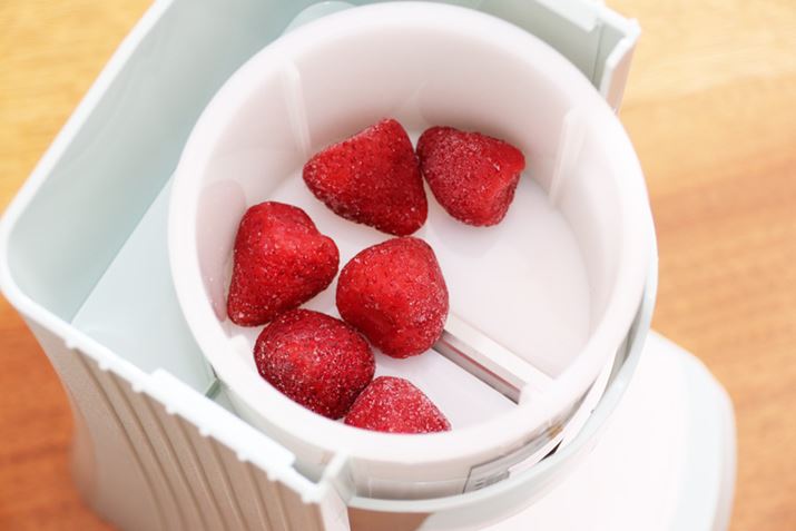 ここまでは前モデルでもできる楽しみ方ですが、ここからは最新モデル「DTY-20」でしかできない市販の冷凍フルーツを使ったかき氷作りに挑戦します! フルーツは糖度が高くやわらかいため、従来モデルでは削りづらかったのですが、DTY-20は刃の素材を変更して強度を高めるとともに、氷をよりしっかりと固定できるように改良することで冷凍フルーツも削ることができるようになったのだそう。もちろん、冷凍フルーツも刃の長さを変えることで異なる食感にすることが可能。ただし、使えるのは市販されている冷凍フルーツに限られています。