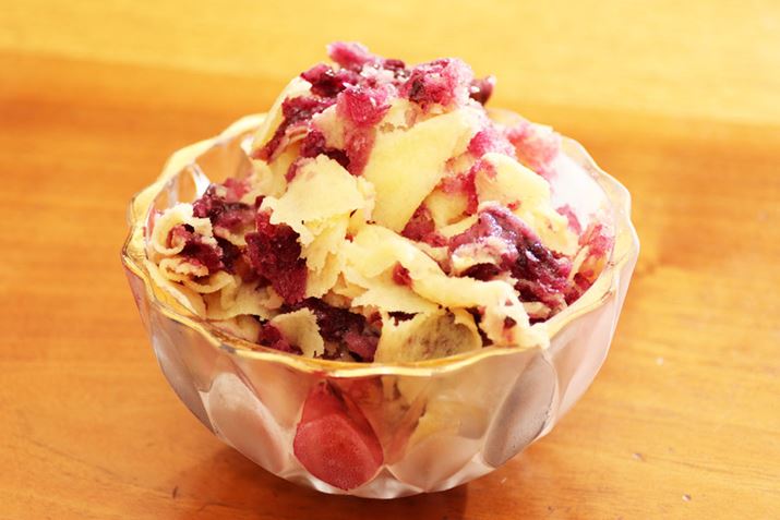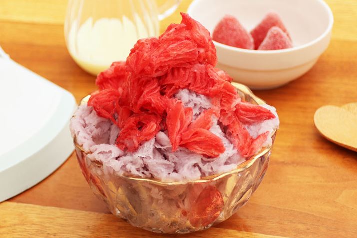 華やかで、ちょっと凝ったかき氷ができました。グレープミルク氷の甘さと冷凍イチゴの酸味がマッチして、食べ飽きることがありません