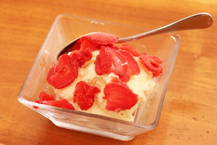 市販のアイスクリームにトッピングするのもあり! 冷凍フルーツのかき氷は想像以上にフルーツ感が味わえるので、トッピングするだけで普通のアイスクリームがリッチになります。見た目がよくなかったので撮影はしていませんが、バニラアイスと冷凍イチゴをグシャグシャに混ぜて食べると、イチゴミルク感が増して最高でした!