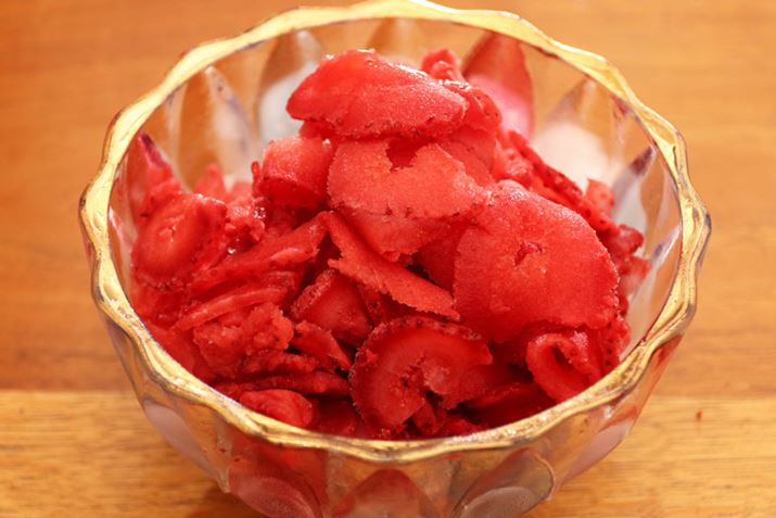 先に作ったかき氷の上に、冷凍いちごをダイレクトに削ってトッピング