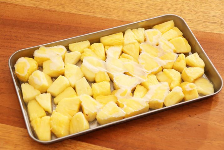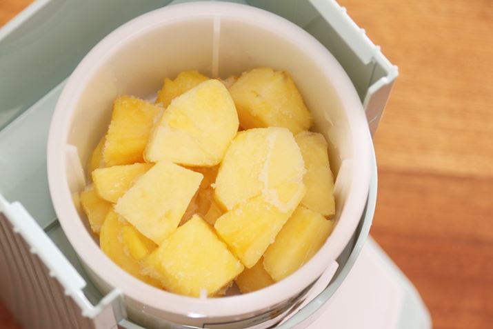 DTY-20の取扱説明書には市販の冷凍フルーツについて、ひと口大サイズ以上のもの、厚い皮が付いたままのものは使用不可と記されていたので、この点を留意し、スーパーで販売されていたカットパインを凍らせてみました
