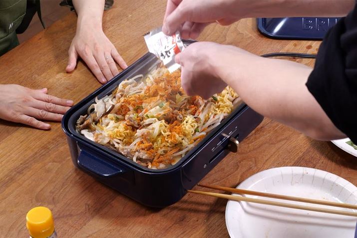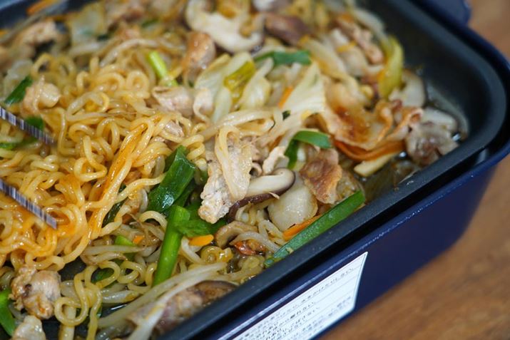 というわけで、辛ラーメンをホットプレートで焼くと、いつもとはひと味違った麺メニューとして楽しめます。これぞ辛うまオトコめし! 大人数で飲食店に入るのが難しい現在ですが、こうやっておうちにいて家族みんなでホットプレートを囲むのはイイですね。