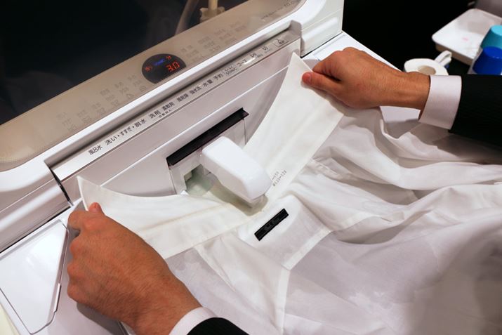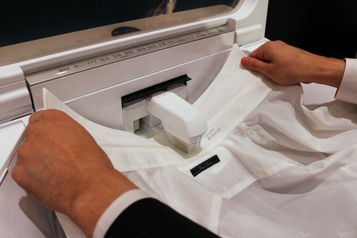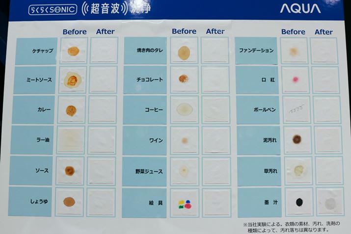 毎秒4万回の超音波振動を起こし、約30秒で汚れを浮かせて弾き出すというらくらくSONICの実力を実演で見せてもらいました。今回は、皮脂汚れと同じ成分の汚れを化繊繊維の布に塗布し、らくらくSONICで洗浄。スタートボタンを押してから洗浄するまでの一連の流れも動画撮影してきたので、ご確認ください。