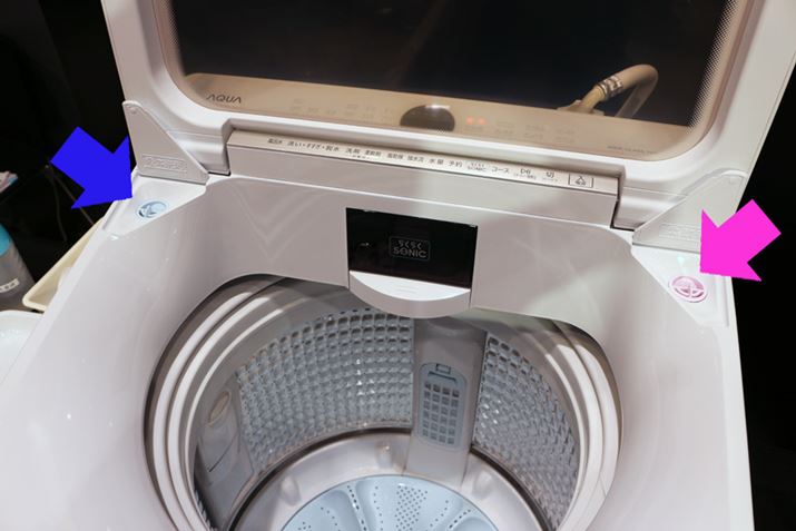 液体洗剤や柔軟剤を入れるタンクは、洗濯槽の両サイドに装備されています。青い矢印のほうが液体洗剤タンク(容量800ml)で、ピンクの矢印のほうが柔軟剤タンク(容量780ml)。どちらも詰め替え用パウチ1本分が入る容量となっています