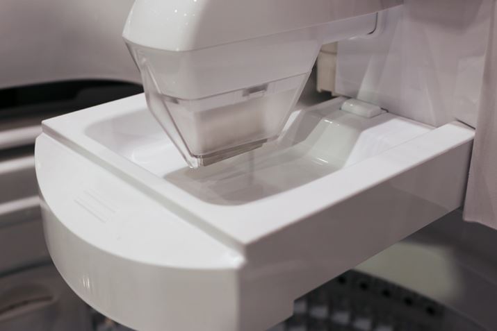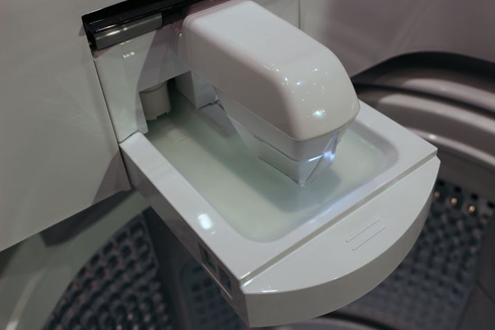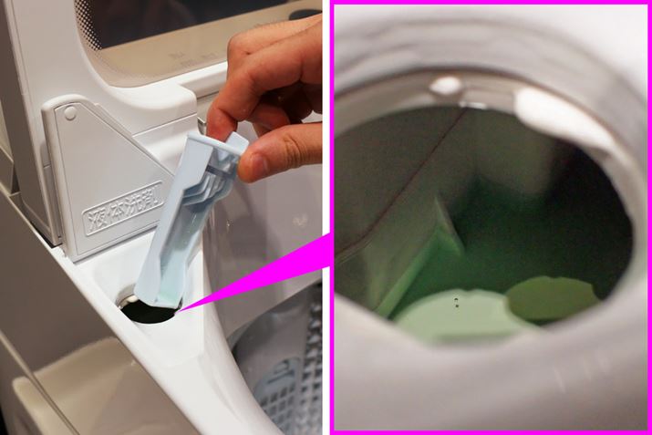 あとは、洗濯槽内にある投入部に液体洗剤や粉末洗剤、柔軟剤を入れるだけ。入れやすい位置に洗濯槽を手動で回す手間を軽減するため、投入部を2か所用意しているのだそう