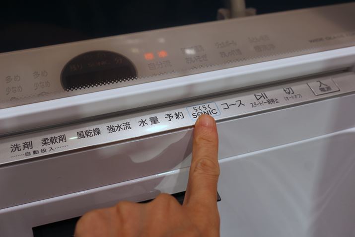 電源を入れ、「らくらくSONIC」ボタン→スタートボタンを押すと、超音波洗浄が始動します。らくらくSONICボタンを押したあと、すぐに運転が始まるほうがスムーズですが、ボタンを押し間違えた際の誤作動を防ぐため、最後にスタートボタンを押す仕様にしているのだそう