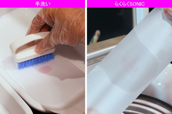 うっすら赤い着色が残ってはいるものの、同じ汚れをブラシを使って手洗いしたもの(右)と比べれば、汚れ落ちの差は歴然