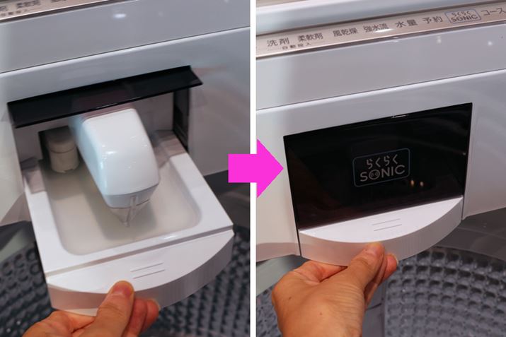 超音波洗浄(らくらくSONIC)で部分洗いした衣類は、そのまま洗濯槽に放り込めばOK。トレイを押し戻し、通常の状態にしたら普通の洗濯が行えます