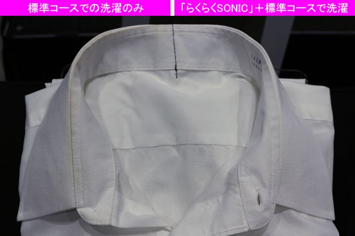 「1日着用し、普通に洗っただけ」(左側)と「1日着用し、らくらくSONICで超音波洗浄してから洗濯する」(右側)を10回繰り返したワイシャツ。超音波洗浄をしたほうが、黄ばみが少ないことがわかります