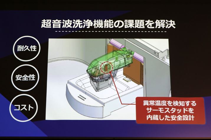 ちなみに、らくらくSONICは約20kgの耐荷重設計となっており、洗濯機の2倍以上の耐久性を保持しているのだそう。また、超音波洗浄はホーンが高速振動するため高温になりやすく、そのまま使い続けると耐久性に大きな問題が発生してしまうため、トレイに水が入った状態でないと作動しないようにしているとのこと。さらに、万が一に備え、ホーンに内蔵したサーモスタッドが異常温度上昇を検知すると、運転をストップする安全設計も施されています
