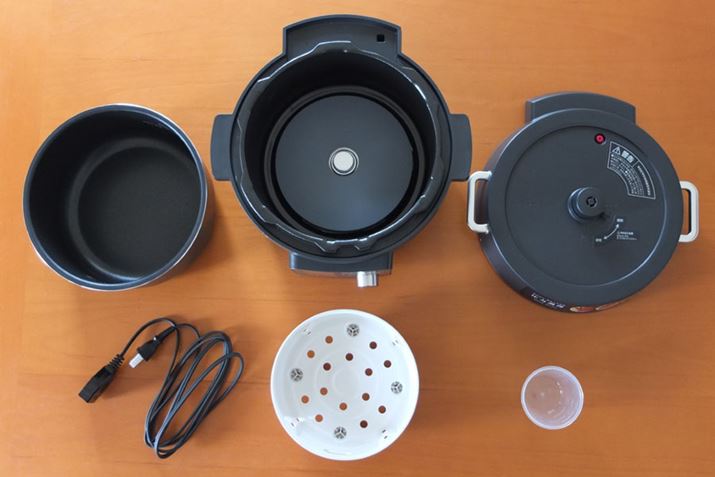 付属パーツ。後方左から、内鍋、本体、ふた、前にあるのは付属品で、左からマグネット着脱式の電源コード、蒸しプレート、白米用計量カップ。これに取扱説明書とレシピブックも付属。「KPC-MA2」とまったく同じ構成です