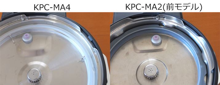 パッキンの取り付け方の比較。左が「KPC-MA4」で右が「KPC-MA2」です。「KPC-MA2」はフタの径が小さいため、ツメにひっかけるだけで安定しますが、「KPC-MA4」はパッキンをリング状のレールにかぶせて、パッキンが動かないようになっています