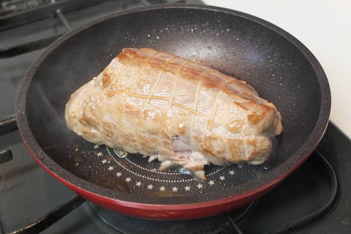 たこ糸で縛った肩ロースかたまり肉の全体に焼き目をつけます。肉をたこ糸で縛るのは形が崩れないようにするためです