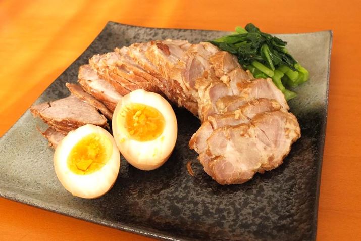 残ったつゆにゆで卵を浸けて味をしみこませたものを添えました。ふだん自宅で作るチャーシューに比べて、より「ラーメン屋さんの味」に近いできあがりとなりました