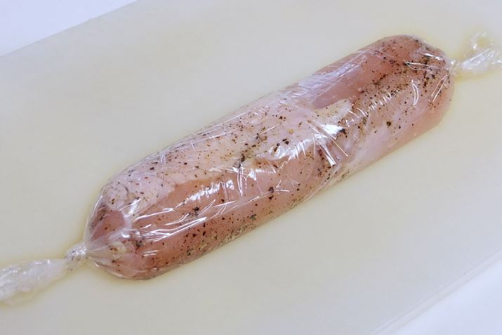 鶏むね肉の厚みのある部分に切れ目を入れて厚みを均一に。さらに包丁で叩いて繊維をつぶしてから砂糖・塩の順にすり込み、ロール状にくるくる巻いてラップでしっかり包みます。この時、巻いた肉の直径が5cm以内になるように、またラップを巻く時、肉とラップの間に空気が入らないように注意します