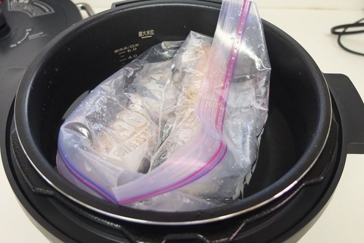 さらにもう1枚ラップで包んだ鶏むね肉を、空気を抜きながらジップロックに入れ、そのジップロック2袋を、水を張った内鍋に入れました。水が最大水位を超えないようにしましたが、ジップロックは浮いた状態で、低温調理中もお湯がうまく循環してくれそうです