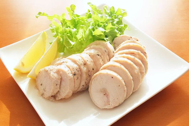 鶏ハムを厚さ2cm程度にカットし盛り付け。皮の部分が真ん中に巻き込まれた状態で、しっかり成形できていました