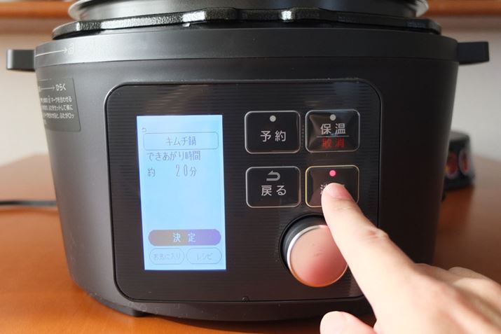 フタを開けた状態でメニュー設定。自動メニューで「キムチ鍋」を選びます(「決定」を押すと火力設定画面に変わります)