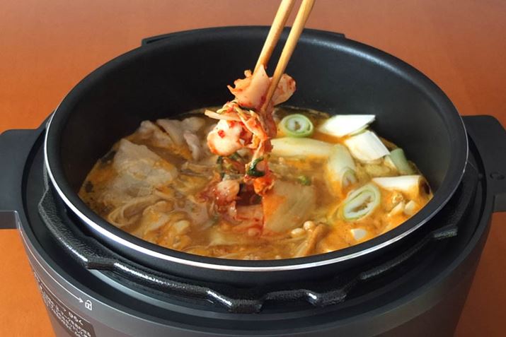 次に作ったのはキムチ鍋。「KPC-MA2」は、フタを取ってなべ料理ができるのも魅力で、本体のフタを取った時の高さが約15.5cmと、低めなのが使いやすいと感じていました。今回大型化された「KPC-MA4」は、当然、鍋の高さも高くなっています。これで鍋料理をすると、使い勝手はどう変わるのでしょう。