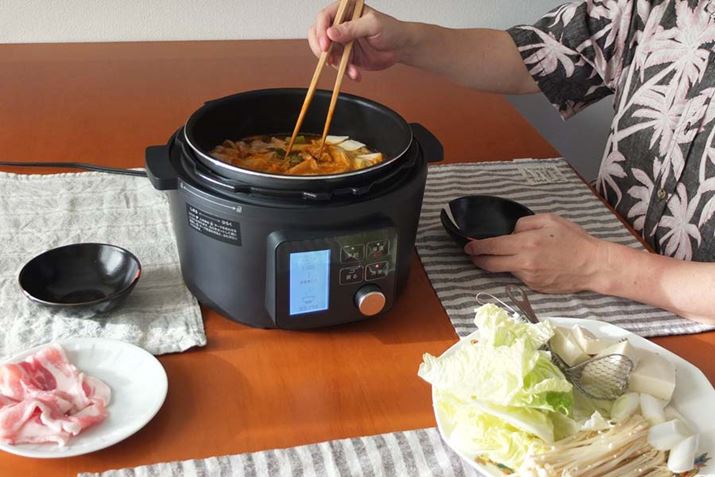 電気圧力鍋なら、テーブルの上でも調理可能。「決定」ボタンを押したら、火加減を見ることもなくほったらかしで料理が完成します