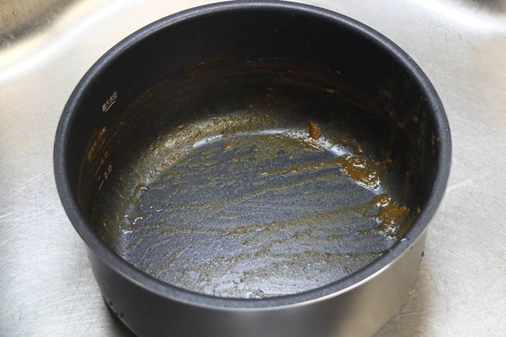 内鍋のお手入れのしやすさは「KPC-MA2」と同様。鍋に付いたカレーの汚れも、しばらくお湯につけて洗えば簡単に落ちます。鍋のコーティングを傷つけないよう、なるべくやわらかい素材を使用し、強くこすらないように洗いましょう