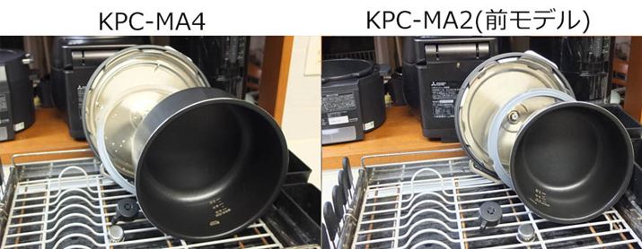 いっぽう、キッチンに置く場所の余裕がないなら、まずは「KPC-MA2」をおすすめしめます。実際、「KPC-MA2」が置けるなら、無理をすれば「KPC-MA4」が置けなくはないと思いますし、デザイン的にも「KPC-MA4」はキッチンになじむと思います。でも、両者を実際に見比べると、「KPC-MA2」のコンパクトさ、圧迫感のなさは、とても魅力的です。このあたりは、実際に量販店に足を運んで比較してほしいところ。また、調理容量は少なめでもいいが、お手入れは簡単なほうがいいという人にも、「KPC-MA2」がおすすめです。