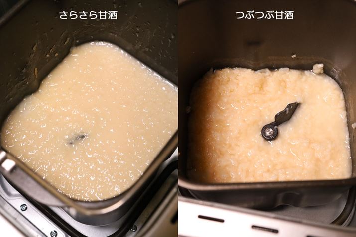 SB-1D151のおもしろいところは、材料の粒を残した「つぶつぶ甘酒」(一般的なホームベーカリーで作れるのはこちら)と、羽根を回転させて粒をつぶした「さらさら甘酒」の2種類の甘酒が作れること。また、手動で加熱時間を6時間から10時間の間で選び、味の調整をすることもできます。加熱時間を長くすると甘みが強くなるのですが、もともと甘酒が苦手な筆者は「さらさら甘酒」をデフォルトの6時間で作ってみたところ、結果は大正解。独特の甘みが抑えられて飲みやすく仕上がりました。これなら風呂上がりに飲める!