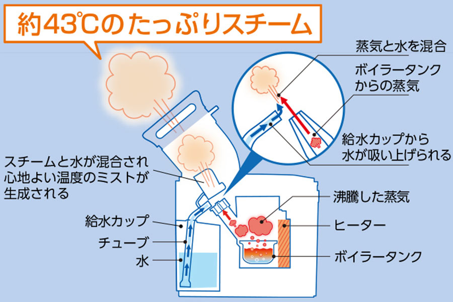 スチームが出る仕組みの図解。給水カップとボイラータンクの2か所に水を入れ、いっぽうを沸騰させて蒸気とし、もういっぽうを水のまま混ぜることで、約43℃という心地よい温度のスチームを作り出します。勢いよくスチームが噴霧されるので、温度を保ったまま口元や鼻元に届くとのこと