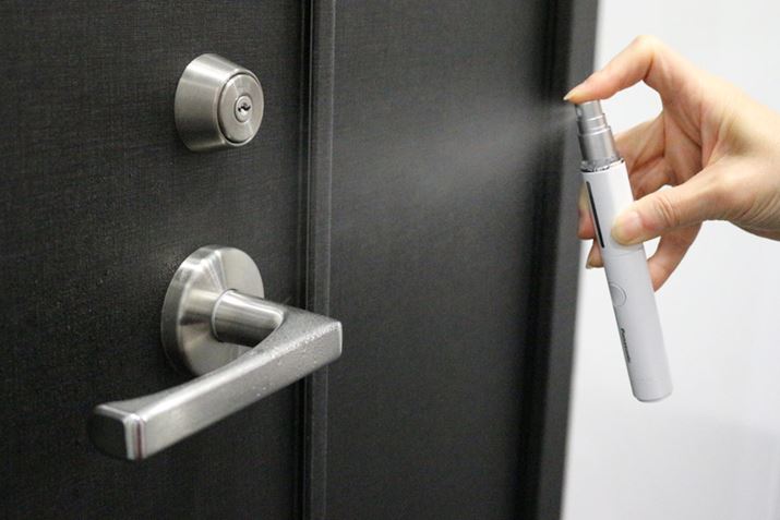 上の動画はドアノブに噴霧しているシーンですが、複数回プッシュしているのは噴霧の様子を見せるためではありません。実は、取扱説明書に「便座やテーブルなどには5回噴霧、衣類や帽子、靴などには3回噴霧する」と記されているので、それにならった使い方をしました。ドアノブは便座やテーブルより面積が小さいので、もしかすると5回噴霧しなくてもいいのかもしれませんが、1回では足りなそう。