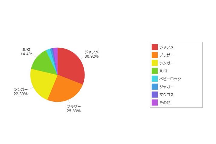 下の円グラフは、価格.comの「ミシン」カテゴリーにおけるアクセス別のメーカーシェアを示したものです。これを見ると、ジャノメ、ブラザー、シンガー、JUKIでカテゴリーのほとんどのアクセスを占めていることがわかります。ここでは、各ブランド・メーカーの特徴を紹介します。