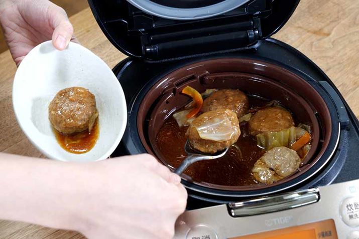そんな悩みを解消できるのが、タイガー魔法瓶の炊飯器「tacook」(タクック)シリーズなんです。こちら、専用のクッキングプレートを使うことで、ご飯を炊きながら一緒におかずも作れるという一石二鳥な炊飯器! おかずの材料を準備してセットしたら、「白米」モードで通常の炊飯をすればいいだけなので、むずかしい操作も必要ありません。ということで今回は、このtacookシリーズを使って、ご飯と同時に超簡単な煮込みハンバーグを作ってみました。以下、動画の内容をダイジェストでご紹介しましょう。