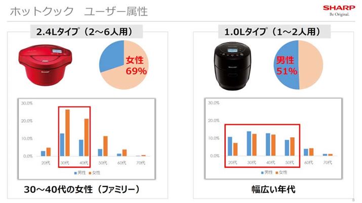 上の画像を見ていただくと、2.4L(2〜6人用)は女性ユーザーが約7割を占め、さらに年齢層も30代と40代に集中しているのがわかる。シャープの分析では、ファミリーユースと見ていて、調理家電としては順当と言える。いっぽう、比較的新しく発売された1.0L(1〜2人用)は、男性ユーザーが過半数の51%を占め、年代層も20代〜50代まで幅広く分散している。これはシャープとしても意外な結果だったとのことだ。