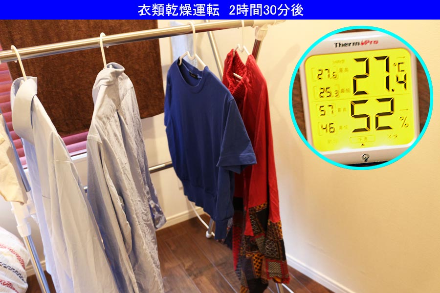 室温は2.7℃上がったものの、湿度は16%ダウン。「検証1」の時とほぼ同等の変化なので、除湿性能は安定していると言えそう。洗濯物は後ろ側に干したバスタオルもきちんと乾いています