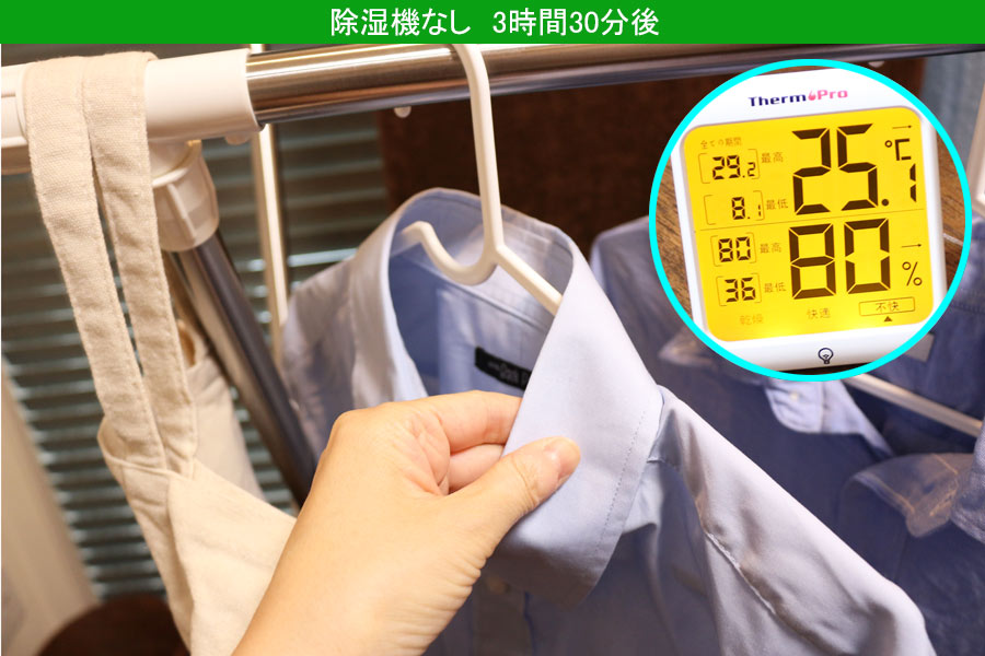 除湿機を使っていないほうは、ポリエステル65%、綿35%のワイシャツの襟と袖口を除く部分がかろうじて乾き始めた印象。室温はスタート時からほぼ変わらないものの、湿度が20%も高くなり、部屋に入った瞬間ムワッとして不快です