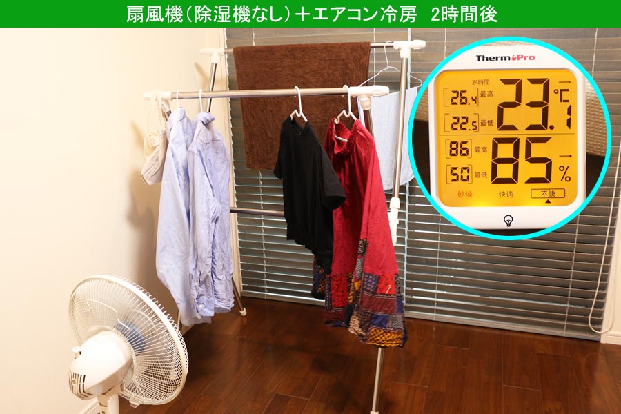 扇風機+エアコンの部屋の洗濯物は、まだまだ湿った状態。かろうじてポリエステル65%、綿35%のワイシャツの薄い生地の部分が乾いたくらいです。そして、エアコンの冷房運転をオンにしているのに、湿度が85%になっていました