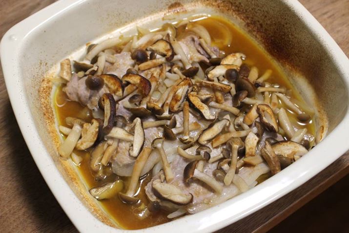 「豚肉とキノコのみそバター焼き」を作ってみました。豚ロース肉、タマネギ、キノコ類をグリルパンに入れ、白ワイン・みそ・しょう油を混ぜた合わせ調味料を上からかけて、バターを載せるだけ