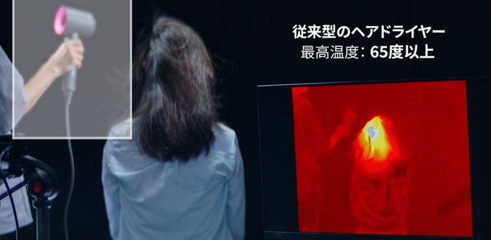 また、Zuvi Haloから放出される風は、温風でないのもポイント。本体に取り込まれた室内と同じ温度の風が放出されるため、髪の毛や頭皮の過度な乾燥が抑えられる。さらに、赤外線光が当たって熱を持った髪に、熱くない風が当たることで髪が冷やされ、髪表面の温度が低下。下の写真はメーカーが行った一般的な熱風式ヘアドライヤー(上)との比較だが、Zuvi Haloのほうが髪の表面温度が30℃以上低い。