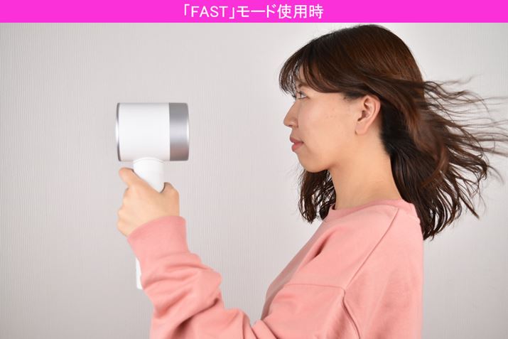 ちなみに、残りの2モードについては、光と風量の出力が異なる設定となっている。「FAST」モードより光と風量を抑えたのが「SOFT」モードで、光はオフにして風のみを放出させるのが「COOL」モードだ。「COOL」モードはクールダウンに使うことができそうだと感じたが、「SOFT」モードは「SOFT」と言うわりには風量がある。光の出力も抑えめになっていると言うが、「FAST」モードでも熱を感じにくいため、この点に関しては瞬時に違いは判断しにくいかもしれない。メーカーによると、「SOFT」モードは「FAST」モードで髪の毛全体をある程度乾かしてから、部分的に乾かしたい時などに使うと便利とのこと。また、子どもの髪を乾かしたり、肌が敏感な人にも使いやすいモードだと言う。