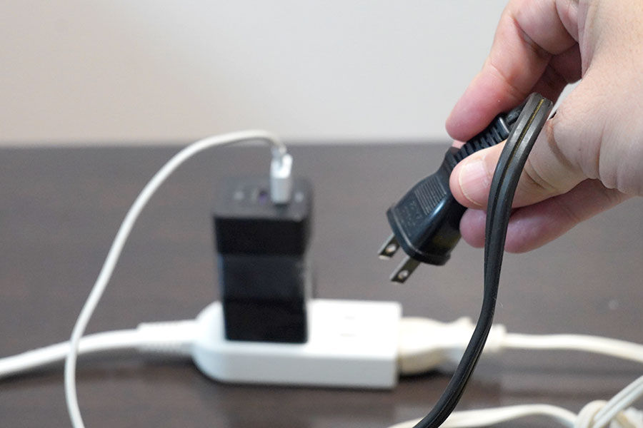 大きめなアダプターや充電器を使っても、ほかの差し込み口に干渉しないんですよね。差し込み口が3個口と少なめな電源タップではありますが、無駄なく使うことができます