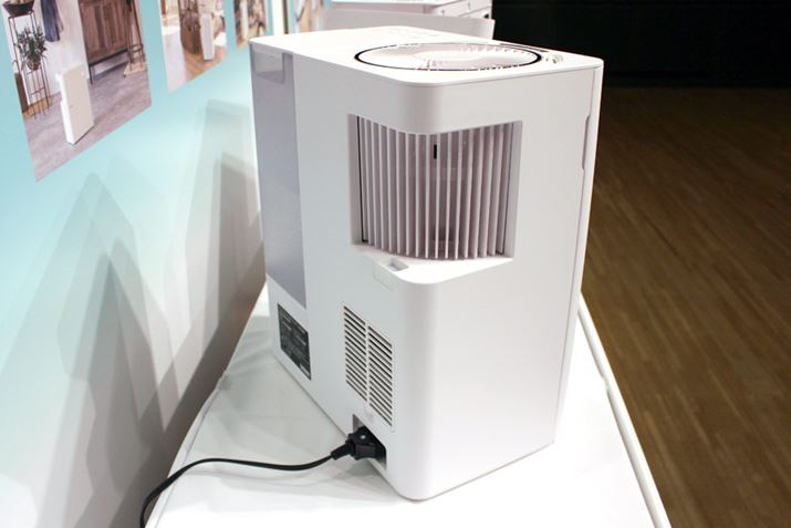 まずは、特に発表会でも注目を集めていた加湿器「SSH-8000」から。スチーム式を採用する単体加湿器で、加湿容量は800ml/h、適用床面積は洋室22畳/和室13.5畳となります。その最も大きなポイントは、「“業界初”サーキュレーターを内蔵するパワースチーム加湿器」をうたっていることです。