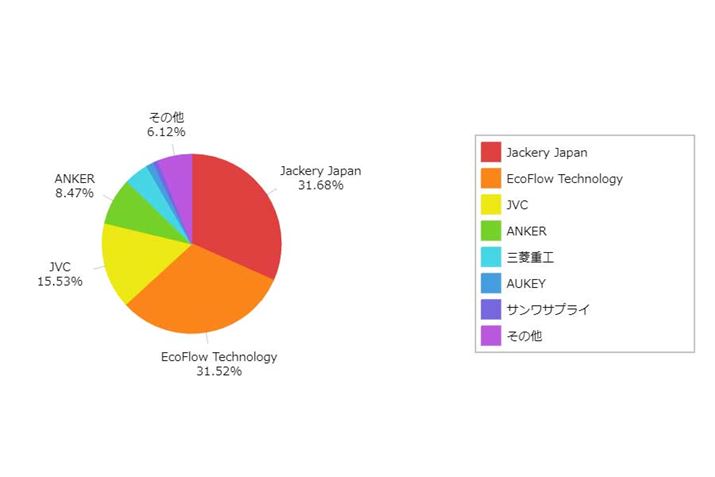 そこで、価格.comの「ポータブル電源」カテゴリーにおけるメーカー別のアクセスシェアを見ると、トップ2となるのが、Jackery JapanとEcoFlow Technology。さらに3位のJVCはJackeryと提携しているため、実質的にはJackery Japanがトップメーカーと言えそうです。